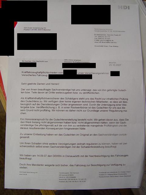 Dann schickt der HDI Sachbearbeiter zwar das Gutachten am 04.10.2007 wegen angeblicher mangelnder Prüffähigkeit zurück.