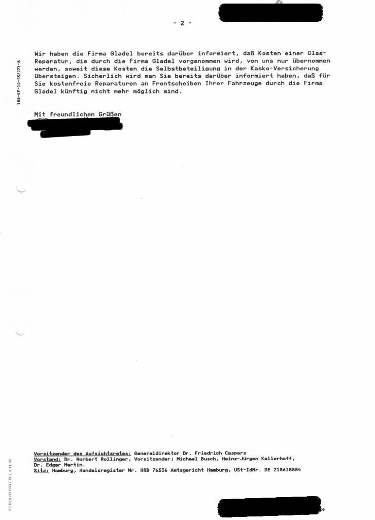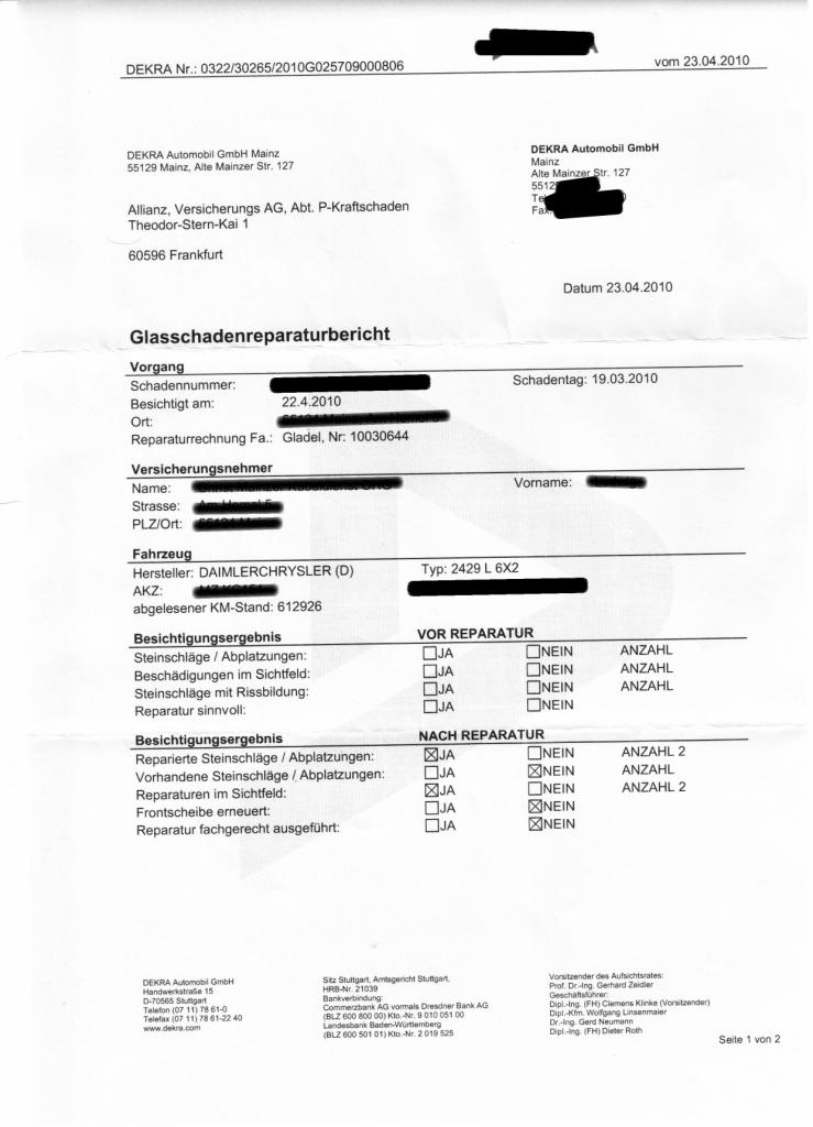 Von dem Gutachten schicken sie mir die 1. Seite, die 2. Seite, auf der die Lage der Steinschlagschäden markiert ist fehlt, auch die Bilder.