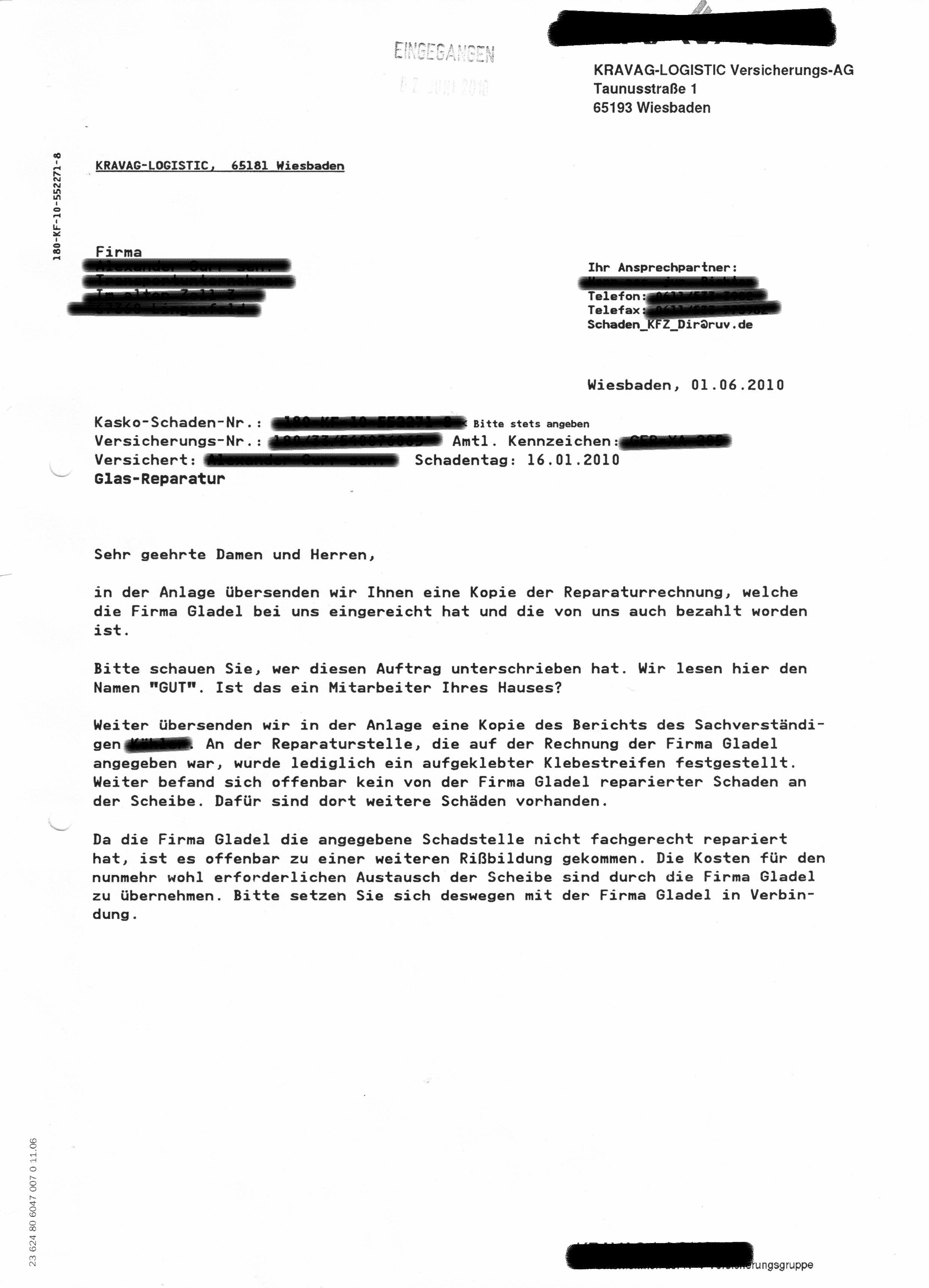 Da steht tatsächlich, dass man mich informiert hat, dass die KRAVAG zukünftig nicht mehr übernimmt…. Der Kunde hat einen Vetrag abgeschlossen, in dem es ein Weisungsrecht derVersicherung nur für den Fall einer Glasreparatur gibt, er hat keinen werkstattgebundenen Vertrag. Offensichtlich ist es dem Kunden wichtig sich frei entscheiden zu können und demnach hätte er vor Vertragsabschluss informiert werden müssen, dass er nicht mehr bei der gewohnten Werkstatt reparieren lassen kann (so fern es zu diesem Zeitpunkt schon so gewesen wäre) Im vorliegenden Fall konnte der Kunde sich nachweislich darauf verlassen, das meine Rechnungen übernommen werden. Eine plötzliche Änderung dieser Geflogenheit ist ein wesentlicher Bestandteil des Vertrages und hätte dem Kunden durch seine Versicherung in schriftform mitgeteilt werden müssen. Auch steht dem Kunden in solchen Fällen ein außerordentliches Kündigungsrecht zu.